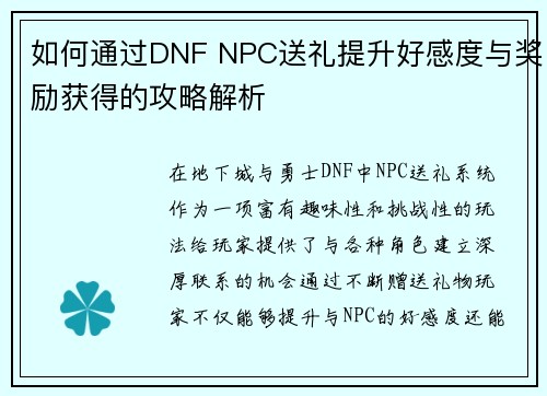 如何通过DNF NPC送礼提升好感度与奖励获得的攻略解析